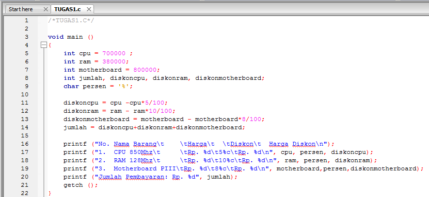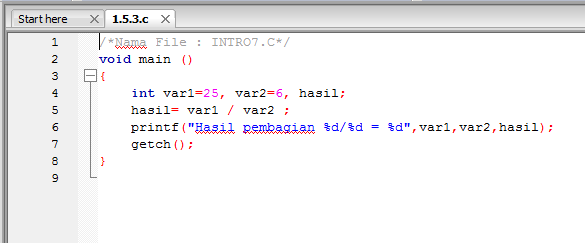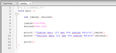 Mempelajari dan mengamati penggunaan fungsi-fungsi dasar turbo C seperti main (), printf (), getch(), getche() yang dipadukan dengan tipe variabel dasar seperti int (bilangan tebal) dan float (bilangan pecahan).