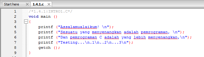 - Membuat program utama dengan fungsi main(). Mencetak string dengan karakter khusus “\n” untuk garis baru.