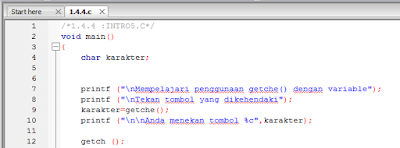 Fungsi getch() digunakan untuk pause atau berhenti. Sedangkan fungsi getche() digunakan untuk mengambil karakter tombol yang di tekan. Jika %c diganti dengan %d maka hasil programnya adalah bilangan bulat. Sedangkan di ganti ke %f maka hasil program adalah bilangan desimal.