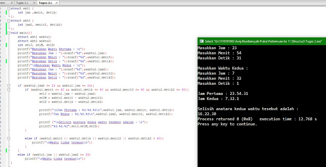 Buatlah program untuk menentukan selisih antara 2 waktu yang berbeda, diamana kedua waktu tersebut dimasukkan melalui keyboard. gunakan struktur waktu, untuk menyimpan kedua waktu tersebut kemudian hitungah selisihnya.